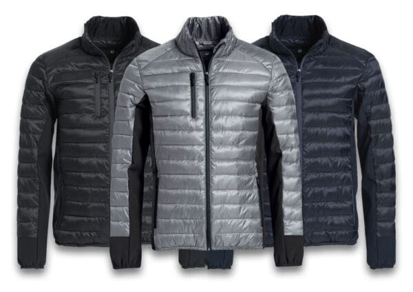 Modern lättvadderad jacka med paneler i softshell. Tre ytterfickor med dragkedjor och två innerfickor. Hörlursögla på insidan av halsöppningen.