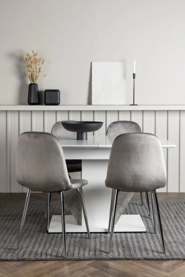 Tillsammans med det förlängningsbara matbordet kommer våra ljusgrå matstolar från serien Eva. Dessa stolar har en helklädd design med en lätt rundad rygg och en sits i lyxigt sammetstyg. De vackra benen i ljusgrå metall ger en modern touch till matgruppen och gör den till en charmig mittpunkt i ditt hem. Ge ditt vardagsrum den stil den förtjänar med den här matgruppen!