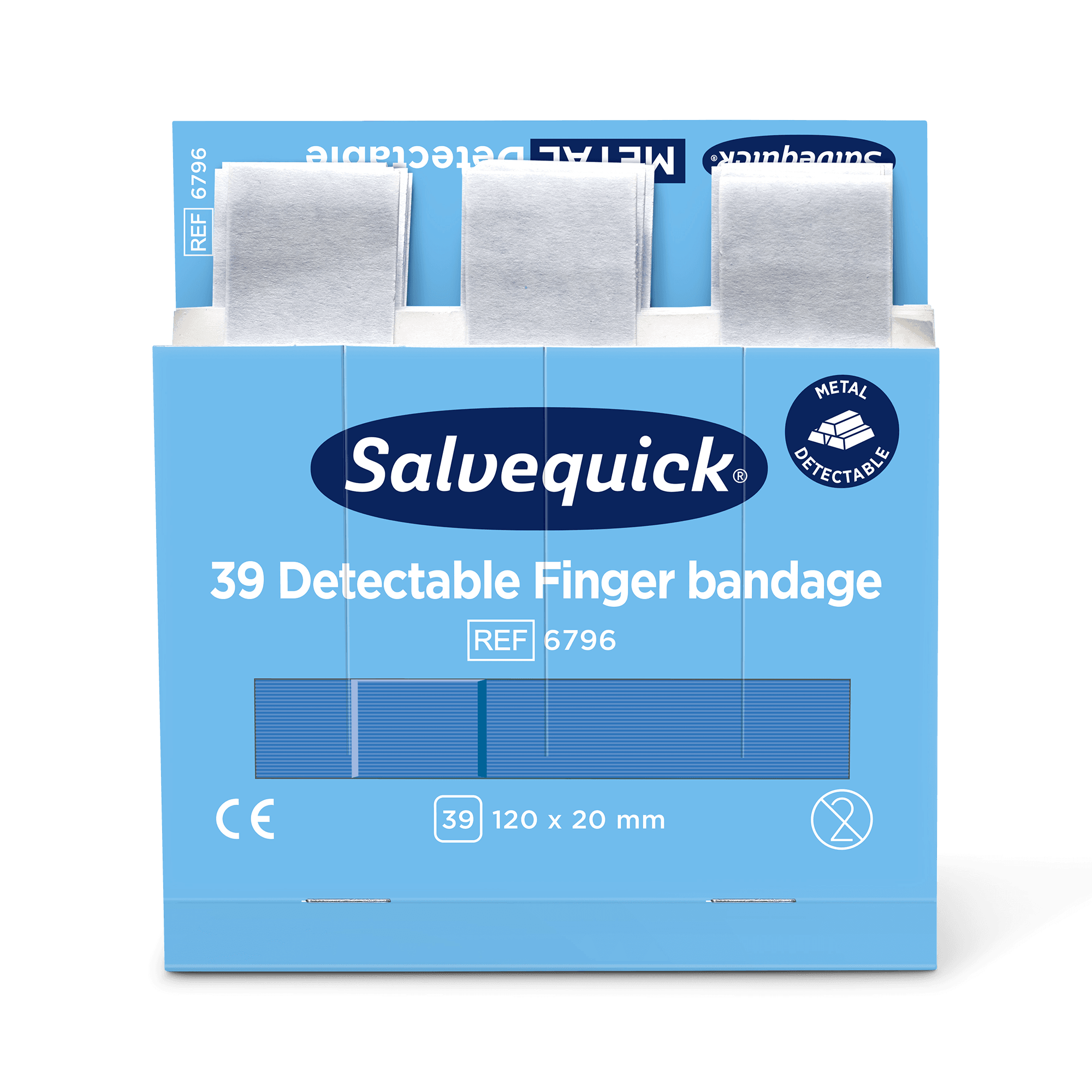 Salvequick Blue Detectable Finger Bandage är extra långa blå plåster som är enkla att linda runt fin gret. Allergivänliga plåster. Passar i Salvequick Plåsterautomat. Extra långa blå plåster som är enkla att linda runt fingret. Mjuka och följsamma, detekterbara i de flesta metalldetektorer som används inom livsmedelsindustrin. Mått: 120 x 20 mm. Varje refill inneh åller 39 plåster, 6 refiller/ask.