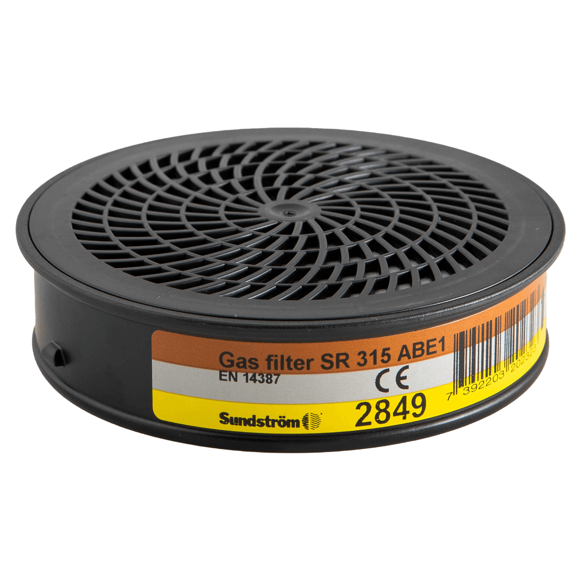 Filter för skydd mot gaser och ångor med optimerad upptagningsförmåga. Gasfilter 315 klass 1 är avsett för användning tillsammans med Sundströms halv- och helmasker. Filtr et är av typ ABE och skyddar mot följande typer av gaser ångor: Typ A skyddar mot organiska gaser oc h ångor, t ex lösningsmedel, vars kokpunkt överstiger +65 °C. Typ B skyddar mot oorganiska gaser och ångor, t ex klor, svavelväte och cyanväte. Typ E skyddar mot sura gaser och ångor, t ex svaveldioxi d och fluor väte. Gasfiltret kan enkelt kombineras med partikelfilter SR 510 P3 R, för att erhålla s kydd även mot aerosoler (partiklar), t ex vid sprutmålning.