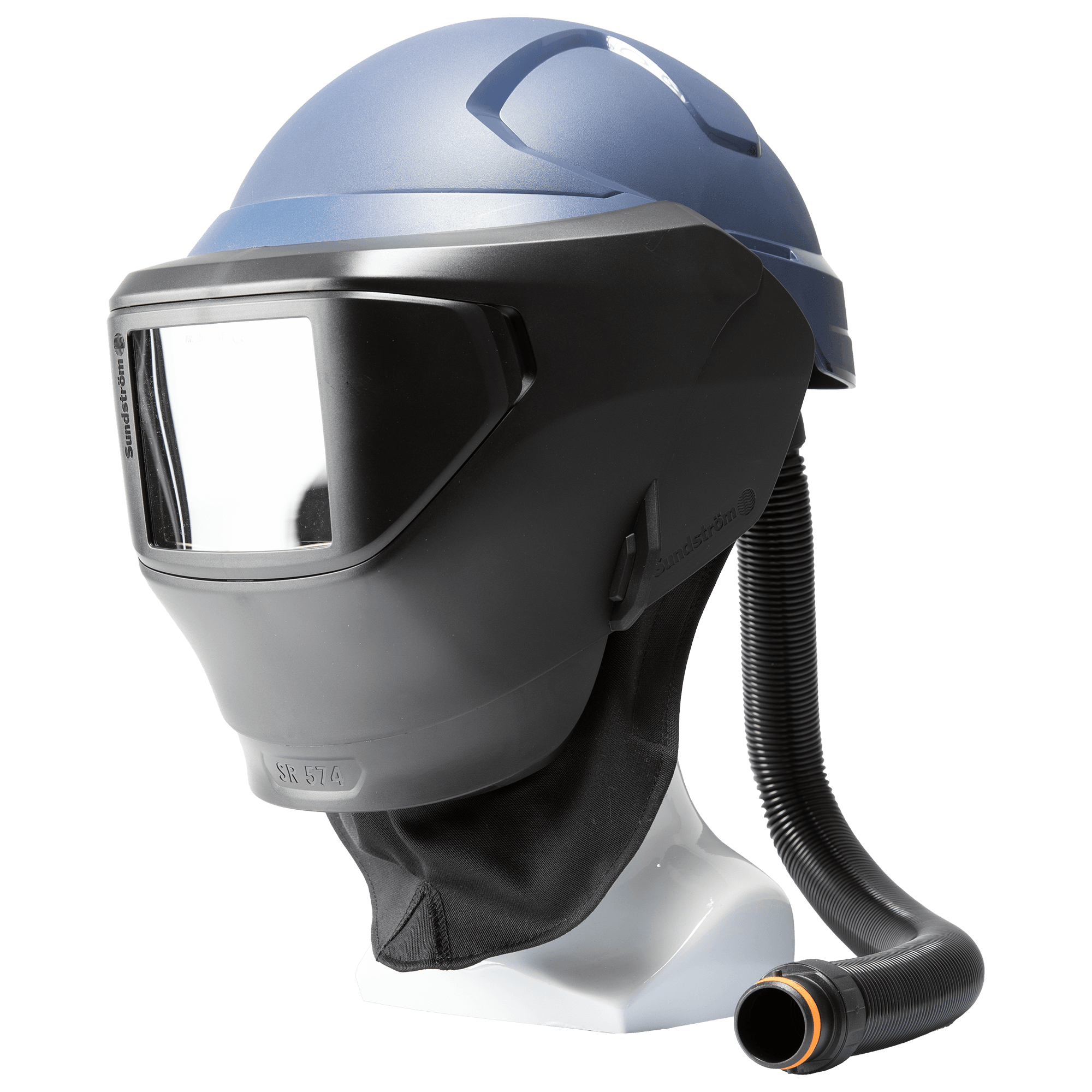 Svetsvisir/Hjälm med visir Svetsvisir SR 574 är avsedd att användas tillsammans med Sundströms hjälm med visir SR 575. Komplett hjälm med svetsvisir tillsammans med den batteridrivna fläkten SR 500 eller SR 700 och godkända fil ter ingår i Sundströms fläktassisterade andningsskyddssystem. Hjälmens andningsslang ansluts till de n filterförsedda fläkten. Övertrycket i hjälmens visir förhindrar partiklar och andra föroreningar a tt komma in i andningszonen. Kombinationerna skyddar mot skadliga gaser/partiklar, strålning och stä nk vid svetsning, skärbränning, slipning och liknande arbeten. Utformningen gör de användbara vid ar beten i trånga och svåråtkomliga utrymmen. Utrustningarna kan användas som alternativ till filtersky dd i alla situationer där sådana rekommenderas. Detta gäller i synnerhet vid tunga, varma eller lång variga arbeten. Före användning ska ett svetsglas med lämplig täthet monteras i svetsvisiret. SR 574 levereras med svetsglas EN 10 och skyddsglas i polykarbonat. Glasen ska vara CE-märkta och av stand ardstorlek 90 x 110 mm. Tillbehör i form av automatiska svetsglas, korrektionsglas, nack- och brösts kydd och slangskydd finns.